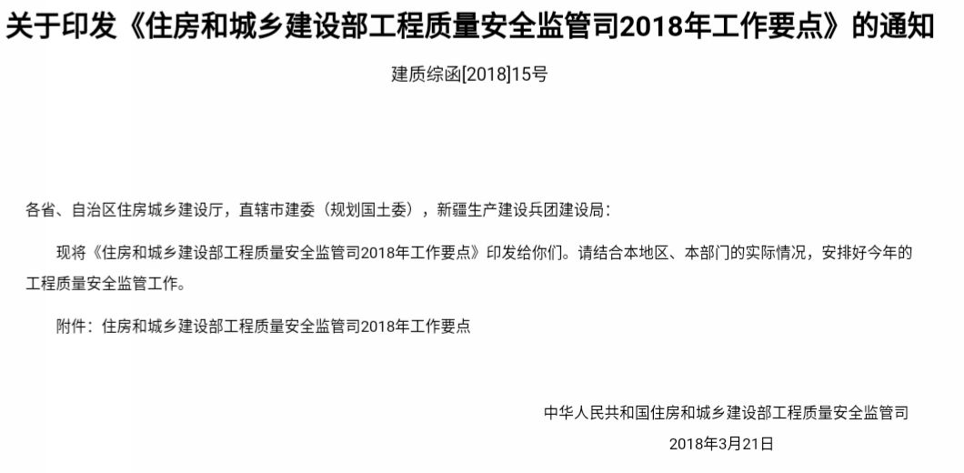 住建部发布2018年工程质量监管要点,明确建设单位承担首要责任。